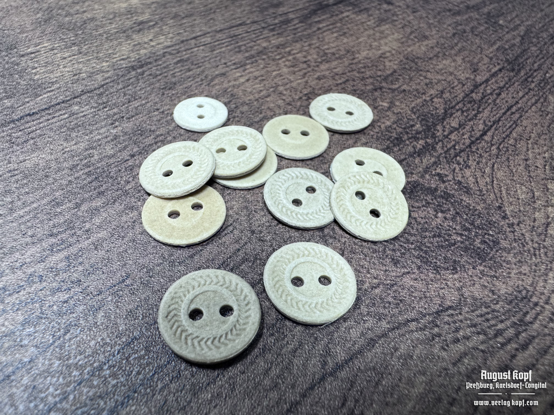 Genuine old 1940-1950 era production lot of paper pressed buttons. 2 Holes, diameter 14mm.