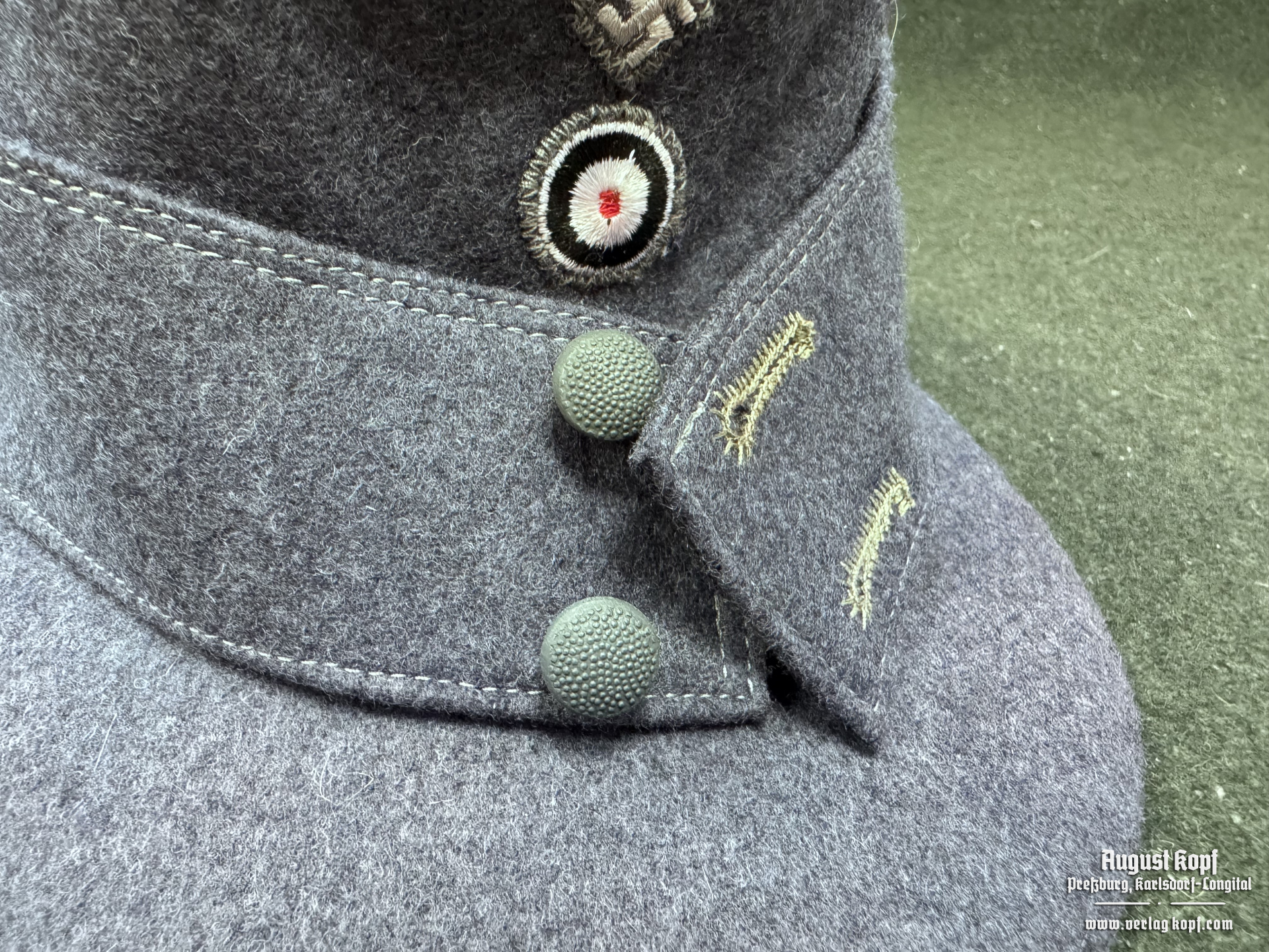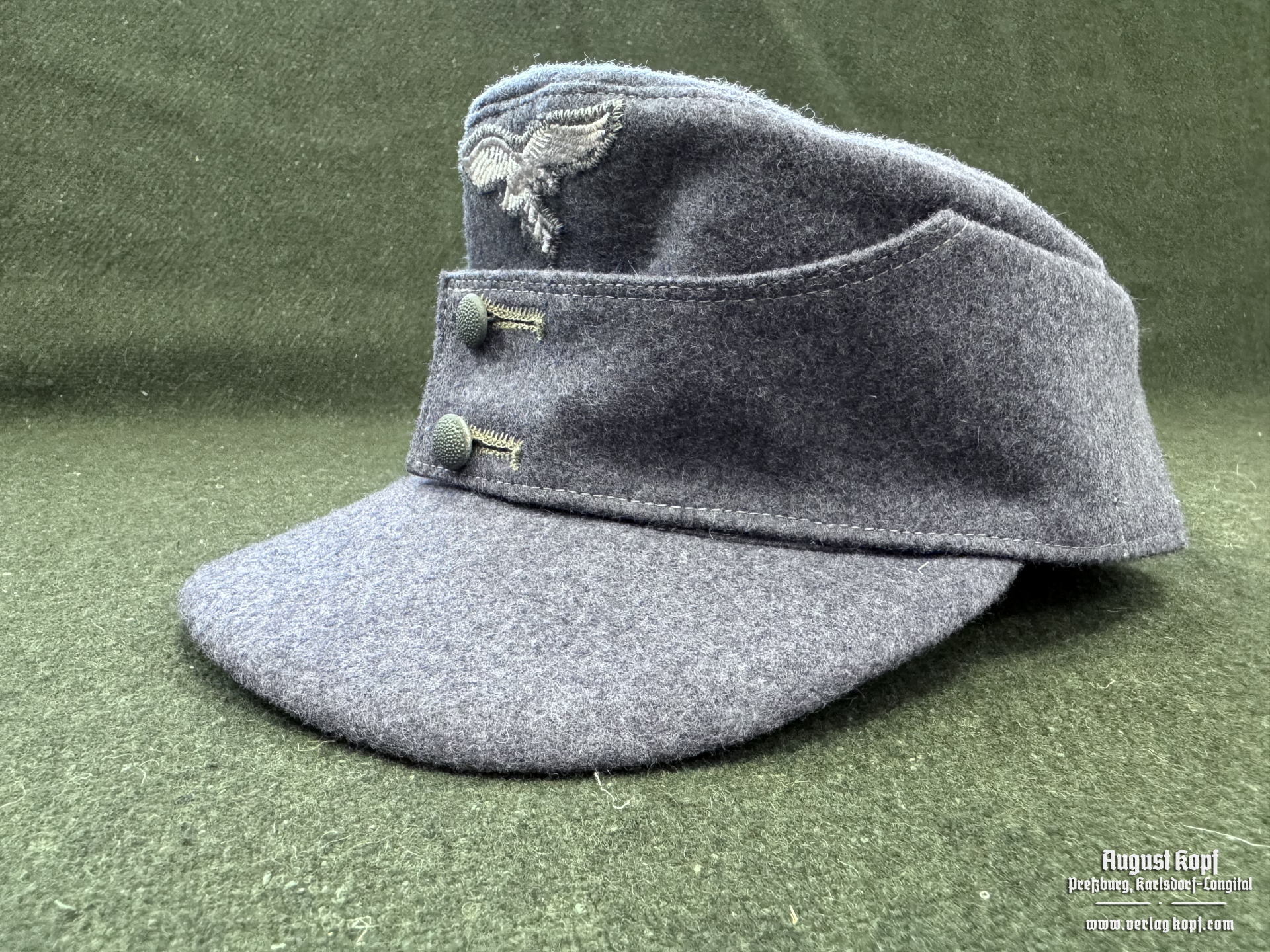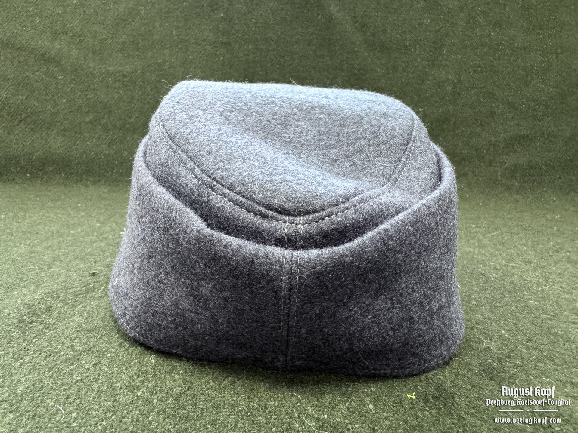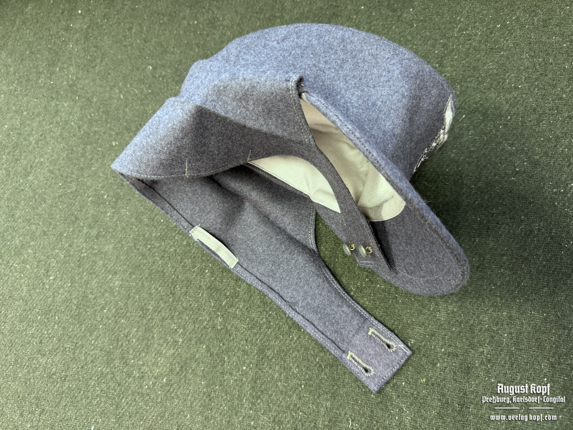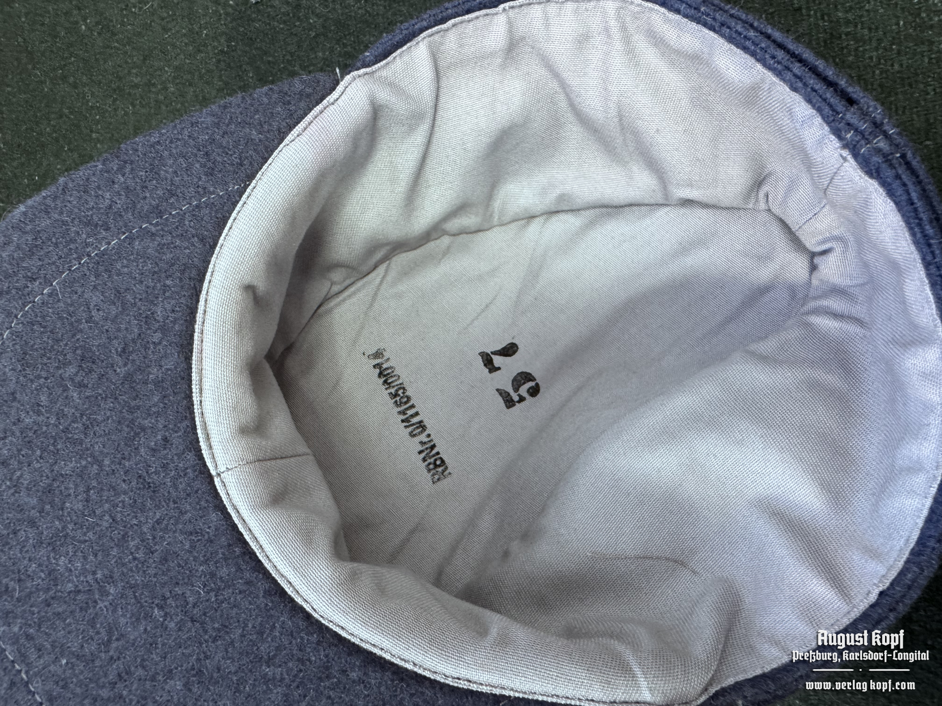 Blaugrau wool cap model 43 with two buttons. Interior is marked with size stamp. Insignia and size is customizable. Please use same marking as for helmet liners (52-62) as for head circumference.