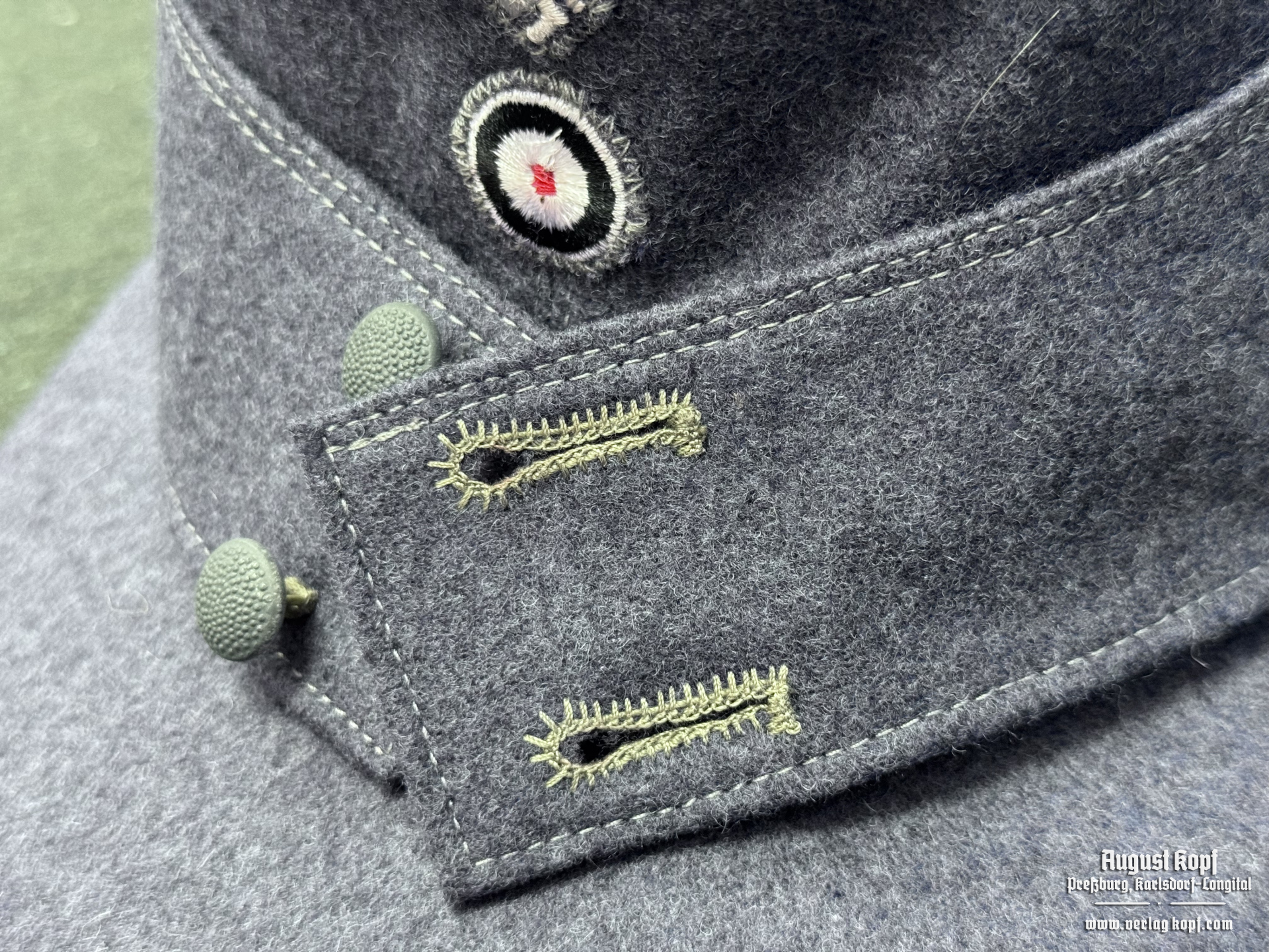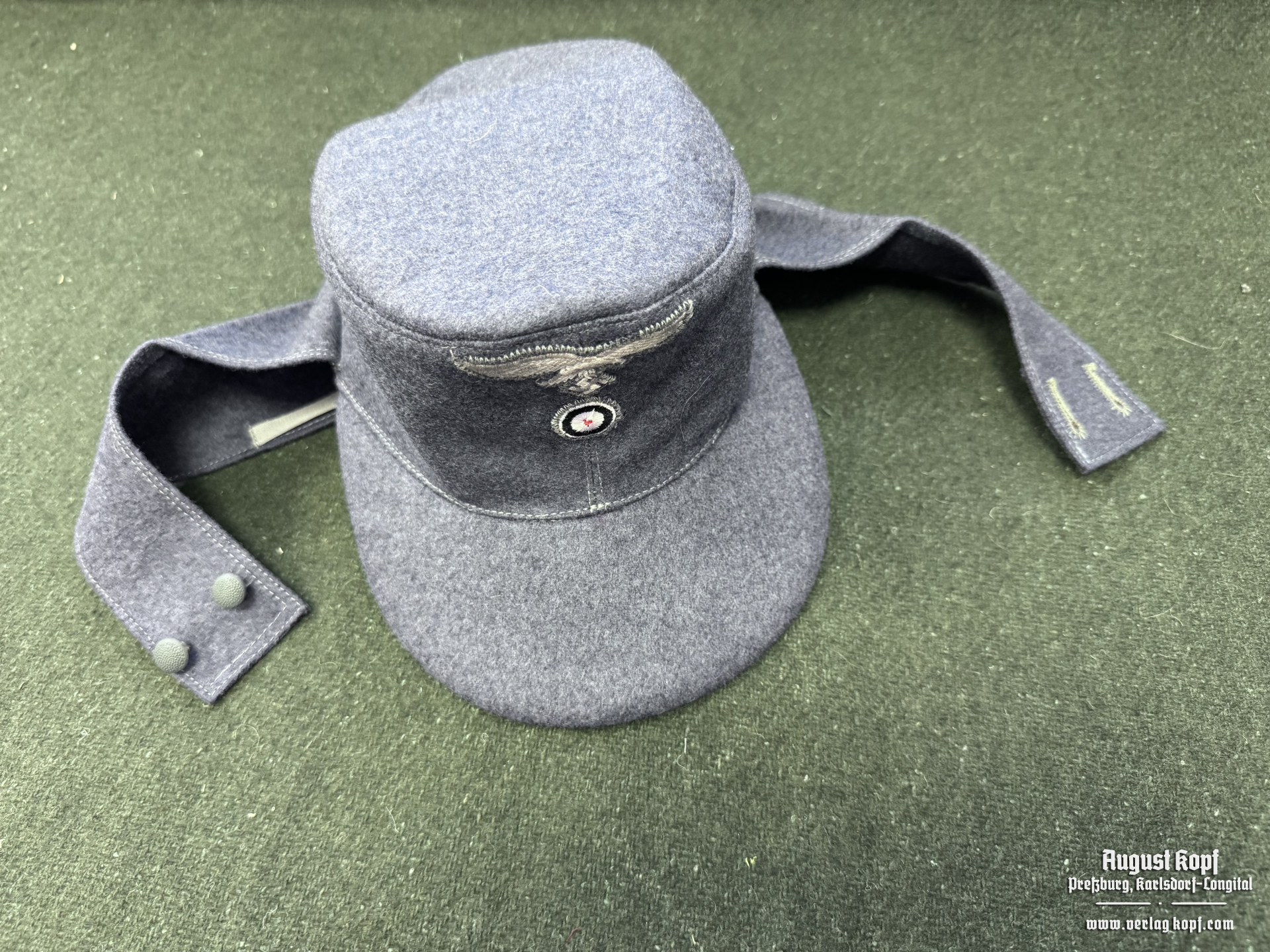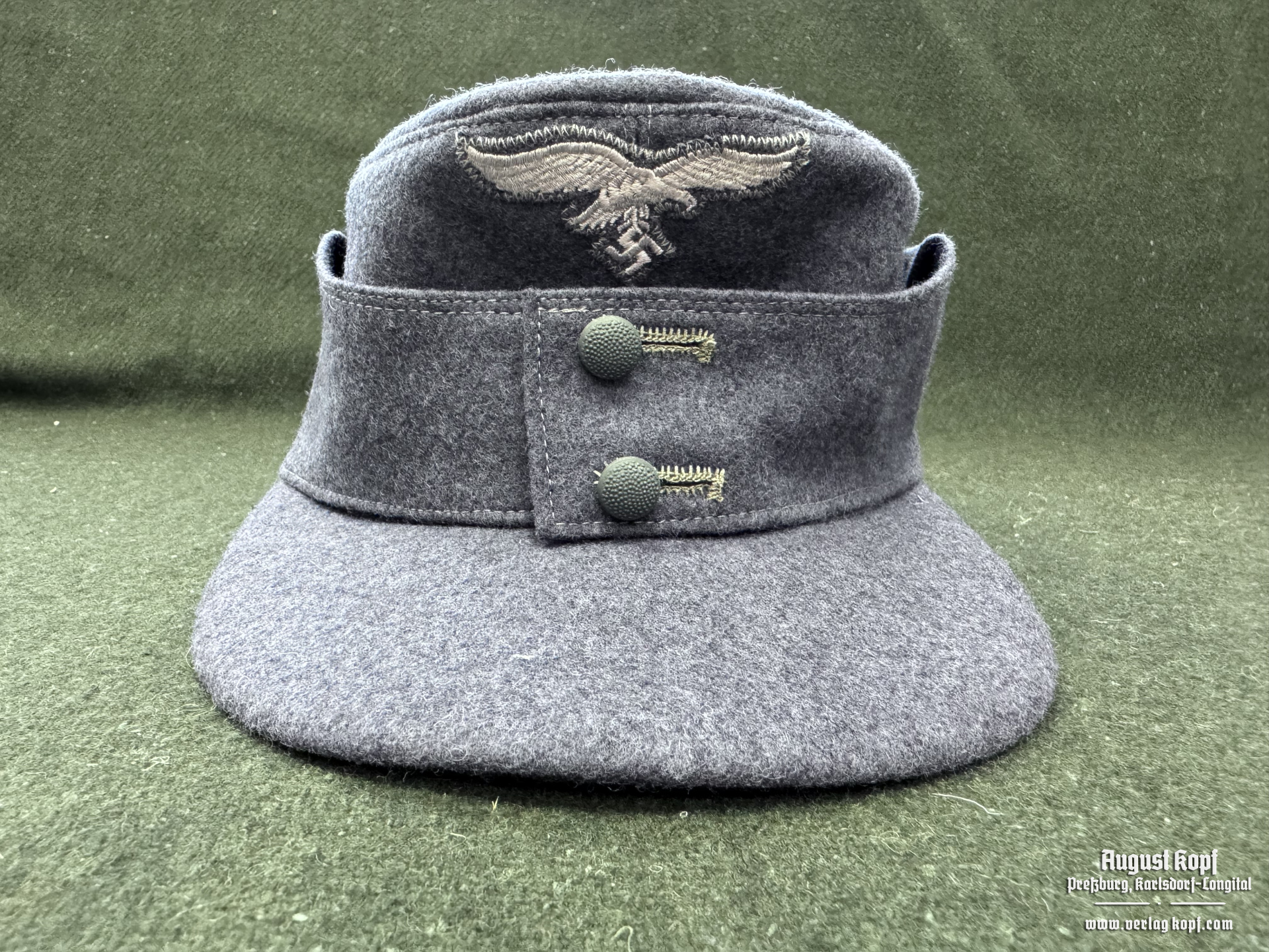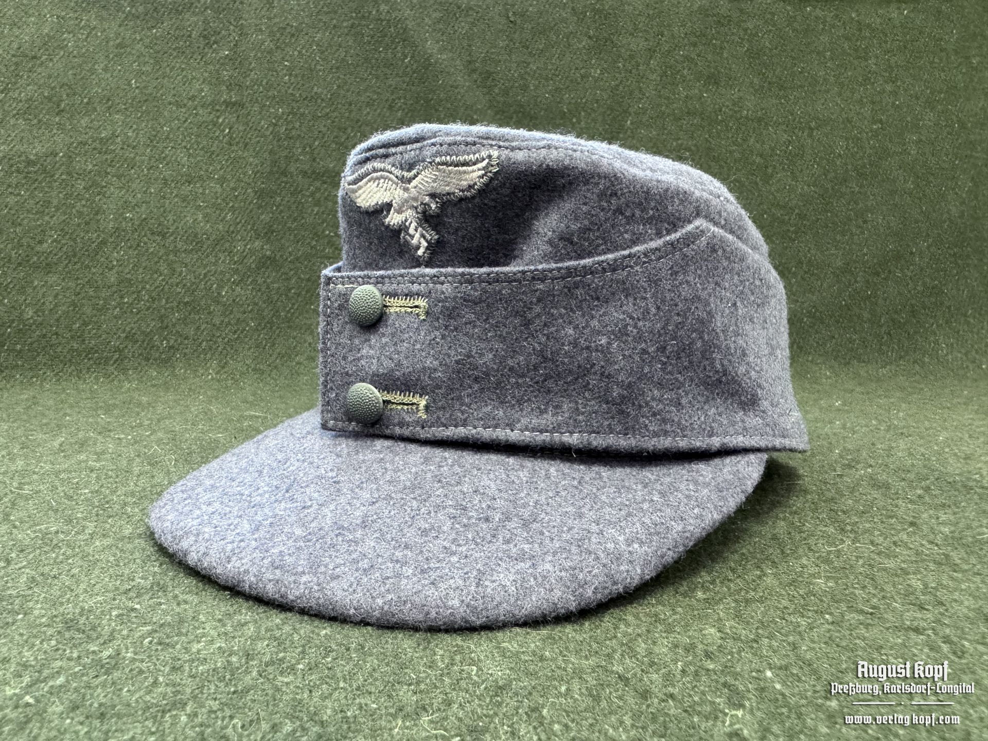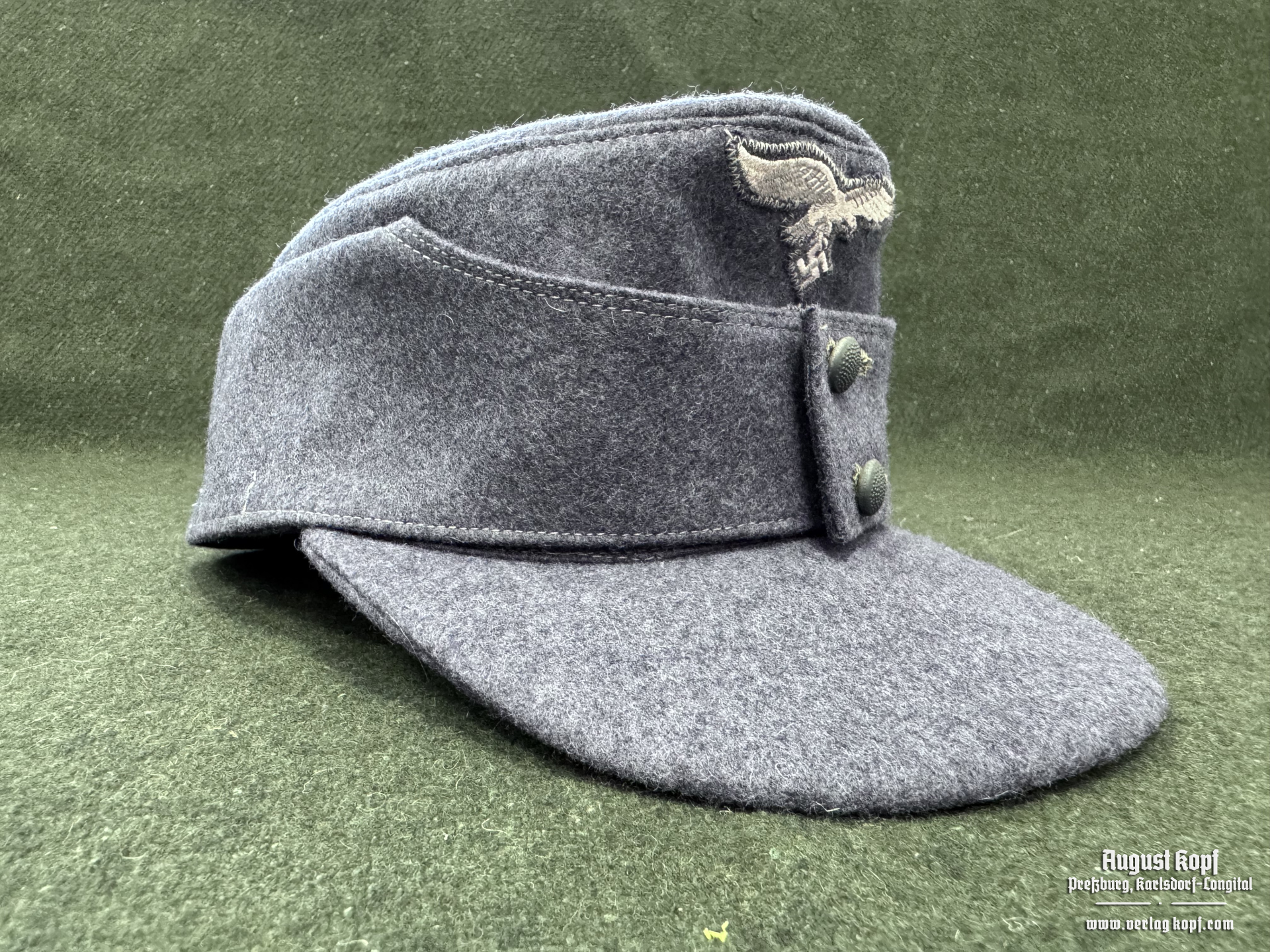Blaugrau wool cap model 43 with two buttons. Interior is marked with size stamp. Insignia and size is customizable. Please use same marking as for helmet liners (52-62) as for head circumference.